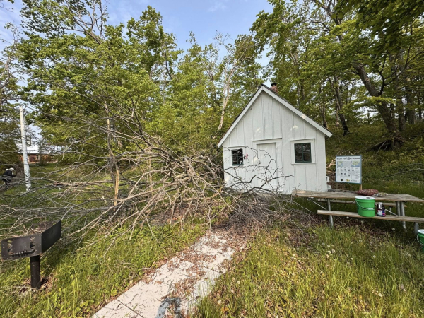 Volunteer Tom McBride began repair on the damaged door and trim and set up the water system. Barb & Linda limbed the downed tree. Sandra mowed. Cathy provided an update to Historical Architect Rob McKay from the DNR.  Board President/Volunteer Linda Posler adds:  “Many thanks to the NPS Manitou staff — Jen, Hailey, and Jay—as well as our founder president, John, and Rob McKay for helping get started on the detritus from the storm….”
