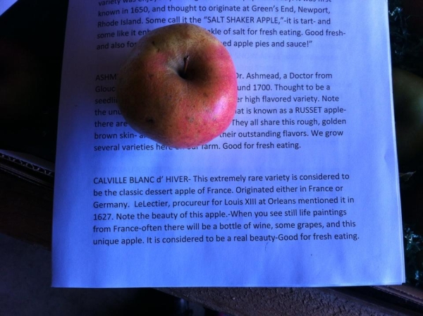 A number of years ago, curious about what variety they were, we took a sample to Kilchermans Christmas farm, Northport, MI who specialize in heritage apples. They identified it as a Caville Blanc d’Hiver, a rare variety considered to be the classic dessert apple of France. Here’s the explanation they provided us.