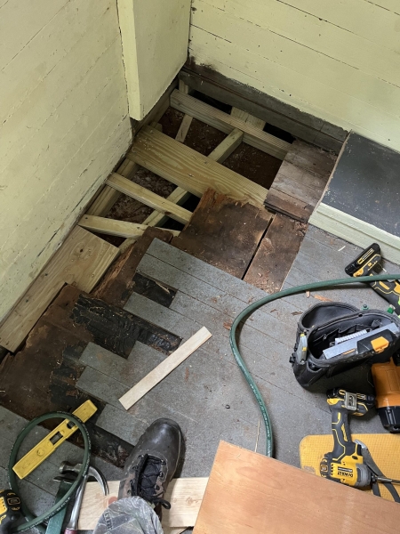 Ben’s been working on the summer kitchen floor repair for several days now. The “soft” floor was even softer underneath. After all the old material was cleared away, he could start to rebuild the supports. Trying to remove as little historic material as possible, he had to angle and piece wood to create a stable base.
