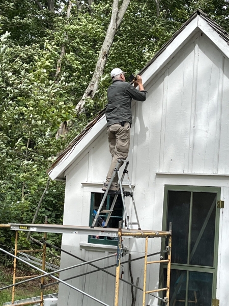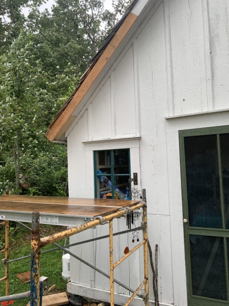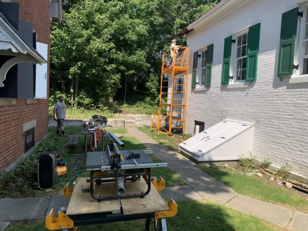 The “carpenter team” arrived noonish and started in immediately to complete work on the rear soffit around the gutter. They had replaced the majority of the soffits on their earlier trip this summer. In this corner, they reconfigured a troublesome downspout connection but needed some specific wood to complete the repair properly.