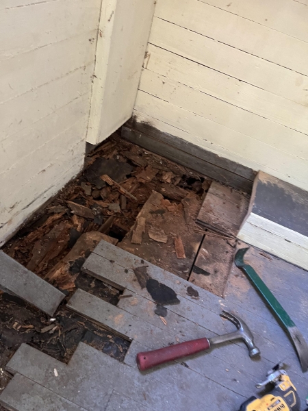 Ben continues reworking the summer kitchen floor. As yesterday’s photo showed, there was a lot of rotten wood to clean out, supports to be rebuilt and only then can the flooring itself be repaired.